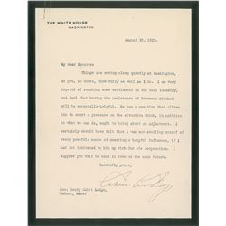 TLS as president, one page, 7 x 9, black-bordered White House letterhead, August 28, 1923. Letter to Massachusetts Senator Henry Cabot Lodge, in full:
