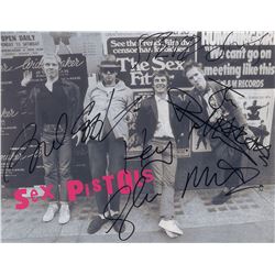 Color glossy 10 x 8 photo of the Sex Pistols leaning against a wall covered in advertisements, signed in black felt tip by Johnny Rotten, Steve Jones,