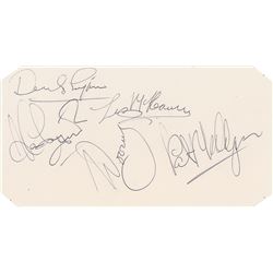 Ballpoint and felt tip signatures of the Bay City Rollers on a bright green 5.75 x 5 sheet and an off-white 7.5 x 3.75 trimmed sheet. Signers include: