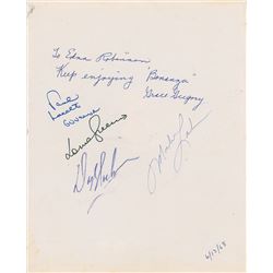 Vintage glossy 10 x 8 photo of Ben, Hoss, and Little Joe Cartwright posing with set designers from the show Bonanza, signed on the reverse in blue bal