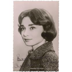 Vintage glossy 3.5 x 5.5 deckle-edge postcard photo of Hepburn in a lovely head-and-shoulders pose, signed in black ink, "Best wishes, Audrey H...