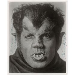 Vintage glossy 8 x 10 close-up photo of the transformed Dr. Glendon from the 1935 film Werewolf of London, signed and inscribed vertically in fountain