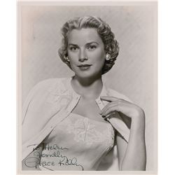 Vintage glossy 8 x 10 studio portrait of Kelly in a head-and-shoulders pose wearing a floral patterned dress and cardigan, signed and inscribed in fou