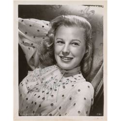 Vintage glossy 8 x 10.25 MGM publicity photo of Allyson wearing a dotted blouse in a reclined pose, signed and inscribed in fountain pen, "To W...
