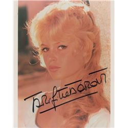 Three items: a glossy 8 x 9.75 photo of Bardot during a provocative dance scene, signed in black felt tip; a color glossy 8 x 10 photo of Bardot in a