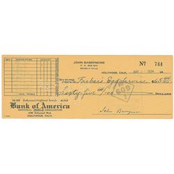 Personal check, 8.25 x 3, filled out in another hand and signed by Barrymore, "John Barrymore," payable to Farbar's Egg Service for $6...