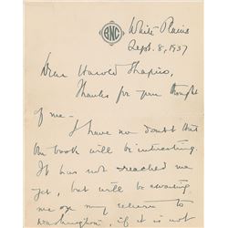 ALS signed “Benjamin N. Cardozo,” two pages, 5 x 6.5, personal monogrammed letterhead, September 8, 1937. Letter to Harold Shapiro, apparently in refe