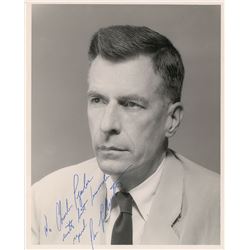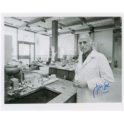 Glossy 10 x 8 half-length photo of Salk standing in his laboratory, signed in blue felt tip. In fine condition.