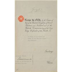 Partly-printed DS, signed “George R. I.,” three pages on two adjoining sheets, 8 x 13.25, June 20, 1919. King George grants Hugh Fraser license &quo...