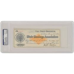 American firearms manufacturer (1819–1892). Cashier of Ilion Bank check, 6.5 x 2.5, filled out and signed by Remington, "S. Remington," pa...