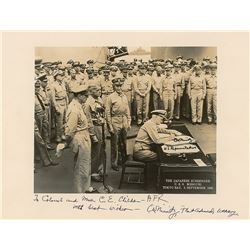 Vintage matte-finish 13.75 x 10.5 photo of Nimitz signing the Japanese surrender aboard the USS Missouri, signed and inscribed in black ink, "T...