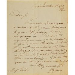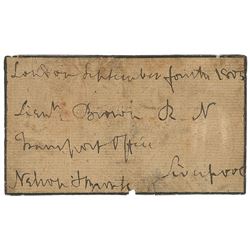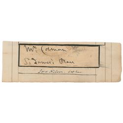 Unsigned handwritten address by Horatio Nelson, "Mrs. Colman, St. James's Place," on an off-white 4.75 x 1.25 slip affixed to a trimme...