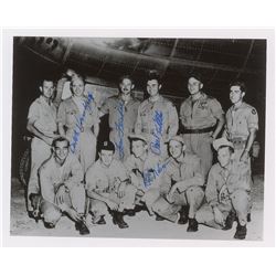 Glossy 10 x 8 photo of the crew of the Enola Gay posing below the aircraft, signed in blue felt tip, "Dutch Van Kirk," "Tom Ferebee,&...