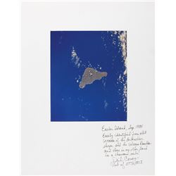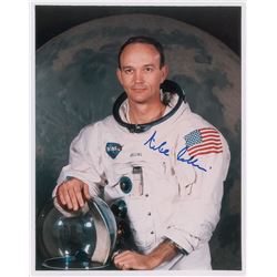 Color semi-glossy 8 x 10 photo of Collins posing in his white space suit against a lunar backdrop, signed in blue felt tip, “Mike Collins.” In very fi
