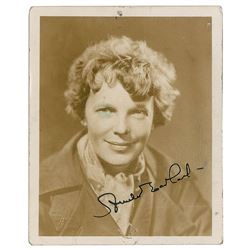 Vintage glossy 3.25 x 4 silver gelatin portrait of Earhart wearing a scarf and aviator coat, signed in black ink. Reverse bears ink notations in anoth