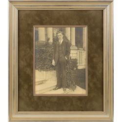 Vintage matte-finish 8 x 10.5 portrait of Lindbergh in a casual full-length pose, showing the pilot posing on a step and wearing a handsome striped su