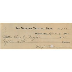 The Winters National Bank check, 8.25 x 3, filled out in another hand and signed by Wilbur Wright, "Wright B os.," payable to Chas. E. Tay...