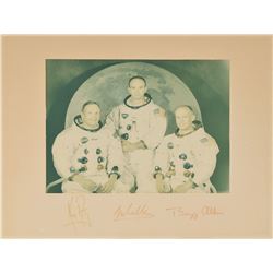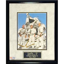Color 7.25 x 9.25 photo of the Apollo 12 crew posing in front of the lunar module, signed in black felt tip Charles Conrad, Richard Gordon and Alan Be