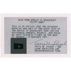 Flown swatch of outer skin material from the Apollo 14 spacecraft Kitty Hawk, .25 x .25, affixed to a 5.5 x 3.5 card, which is signed and flight-certi