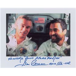 Color satin-finish 10 x 8 photo of the Apollo 17 moonwalkers en route to Earth aboard the Command Service Module America, signed in blue felt tip, &...