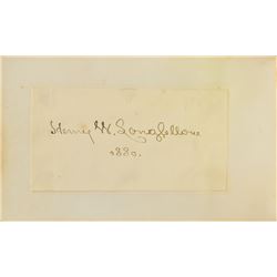 Ink signature, "Henry W. Longfellow, 1880," on an off-white 4.5 x 2.25 slip affixed inside a vintage leather-bound 6.75 x 4 autograph book...