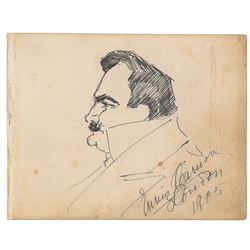 Fantastic original self-portrait sketch by Caruso, showing himself in profile, accomplished in ink on an off-white 7.5 x 5.75 sheet, signed in the low