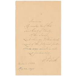 Appealing AQS on an off-white 4.25 x 7 sheet, signed at the conclusion in ink, "S. F. Smith, Written in 1832, May 24, 1895." Smith neatly ...