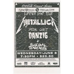 Original black-and-white 11 x 17 first printing poster for Metallica at Jones Beach on June 8, 1994, signed in gold ink by James Hetfield, Lars Ulrich