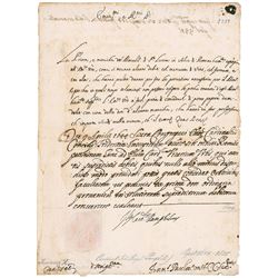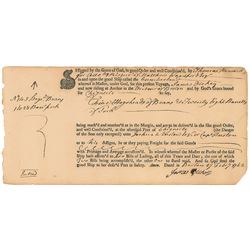 Partly-printed DS filled out in Hancock’s hand but unsigned, one page, 9 x 4.5, February 7, 1762. A bill of landing filled out by Hancock, incorporati