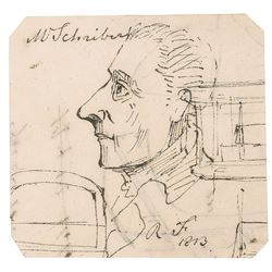 Original ink sketch of a side-facing view of a gentleman with surrounding mechanical diagrams on an off-white 2.5 x 2.5 clipped sheet, titled at the t