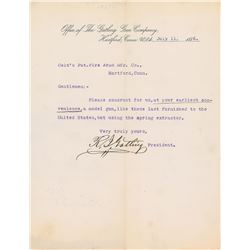 Rare TLS signed “R. J. Gatling,” one page, 8.5 x 11, Office of the Gatling Gun Company letterhead, July 11, 1885. Letter to Colt's Pat. Fire Arm...