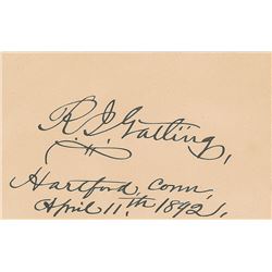 Neat ink signature, "R. J. Gatling, Hartford, Conn., April 11th, 1892,” on an off-white 3.75 x 2.25 card. In fine condition.