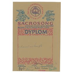 Desirable woodblock-print diploma from the 1975 Polish Festival of Sacrosong, 9 x 13, signed in the center in bold ink, "Karol card. Wojtyla,&q...