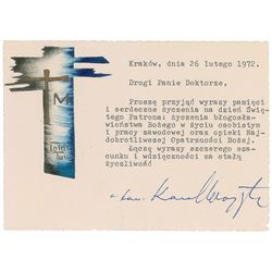 TLS in Polish, signed “Karol card Wojtyla,” one page, 5.75 x 4, illustrated "Totus Tuus" stationery card, November 6, 1968. In full (rough...