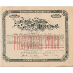 Partly-printed DS, one page, 10.75 x 8.75, March 16, 1906. Stock certificate for one hundred shares of the Louisville and Southern Indiana Traction Co