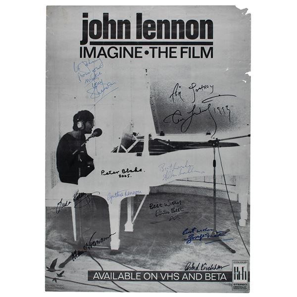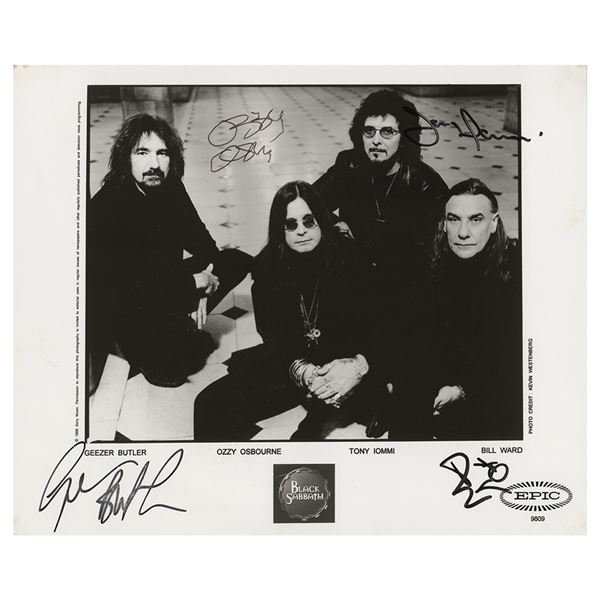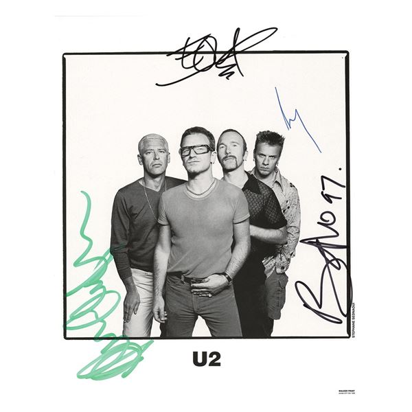 Semi-glossy 8 x 10 paperstock publicity photo of U2, signed in black felt tip, "Edge" and "Bono 97," in blue ink, "Larry,&q...
