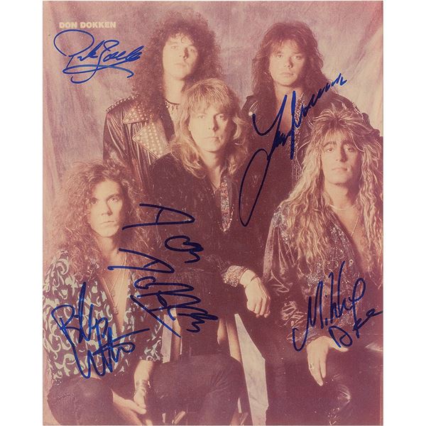 Color glossy 8 x 10 photo of the heavy metal band Dokken, signed in blue felt tip by Don Dokken, Mikkey Dee, John Norum, Billy White, and Peter Baltes