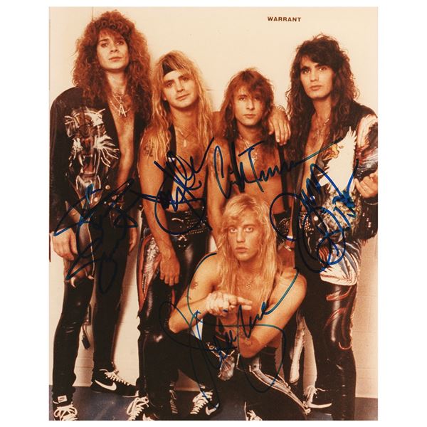 Color glossy 8 x 10 photo of the glam metal band Warrant, signed in blue felt tip by Steven Sweet, Erik Turner, Jerry Dixon, Joey Allen, and Jani Lane