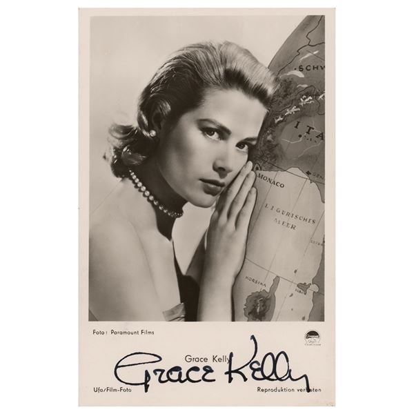 Vintage pearl-finish 3.5 x 5.5 German postcard photo of the Paramount Pictures leading lady, signed in the lower border in fountain pen by Grace Kelly