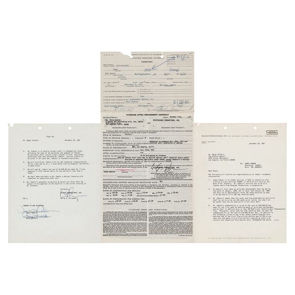 Three documents signed by actors: a 1957 employee's personnel statement for 20th Century Fox, signed by Lana Turner; a 1967 Selmur Productions d...