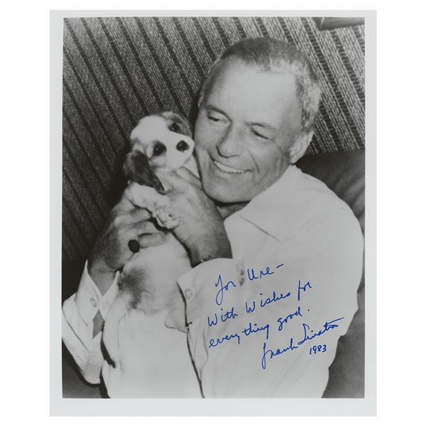 Glossy 8 x 10 photo of Sinatra holding an American Cocker Spaniel puppy, signed and inscribed in blue felt tip, "For Ure—w