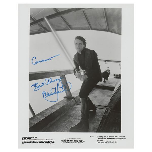 Glossy 8 x 10 20th Century-Fox publicity of Mark Hamill as Luke Skywalker armed with a lightsaber in Return of the Jedi, signed and inscribed in blue
