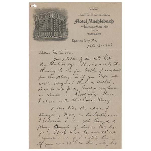 Uncommon ALS, two pages, 6 x 9.5, Hotel Muehlebach letterhead, February 18, 1926. Handwritten letter to "Mr. Miller," in part: "Your ...