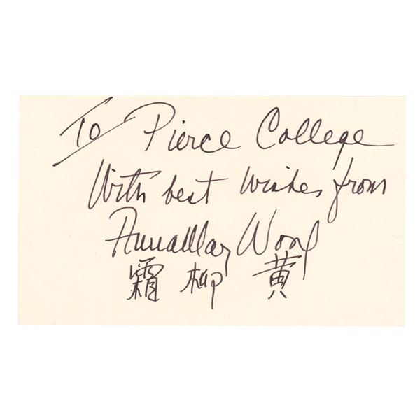 Vintage fountain pen signature and inscription, "To Pierce College, With best wishes from Anna May Wong," on an off-white 5 x 3 card, addi...