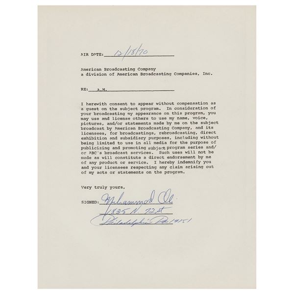 DS, one page, 8.5 x 11, December 18, 1970. Ali agrees to appear on an ABC program "without compensation as a guest." Neatly signed at the ...