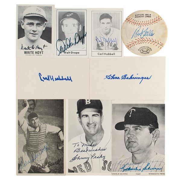 Nine items signed by notable baseball players, including signatures, photos, and promo cards. Signers are: Bob Feller, Charles Gehringer, Carl Hubbell