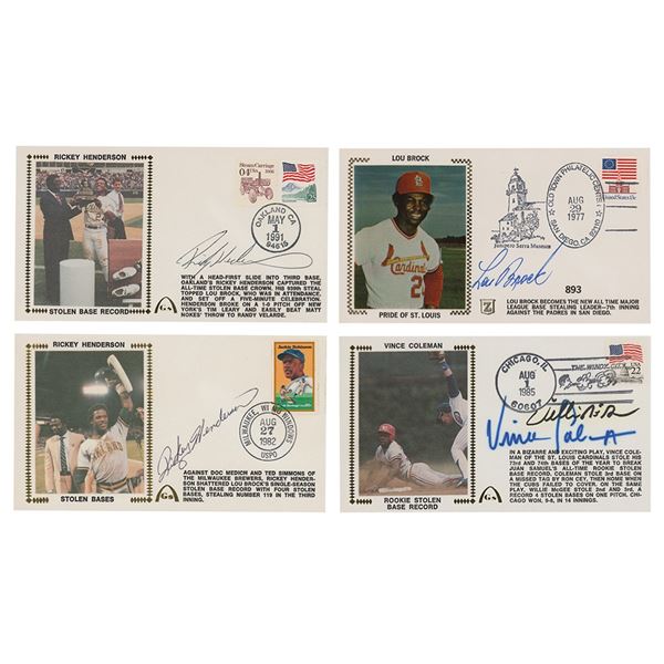 Four Gateway covers with silk color cachets honoring baseball's top thieves on the basepaths, each signed in ink by the subject. Includes: Ricke...