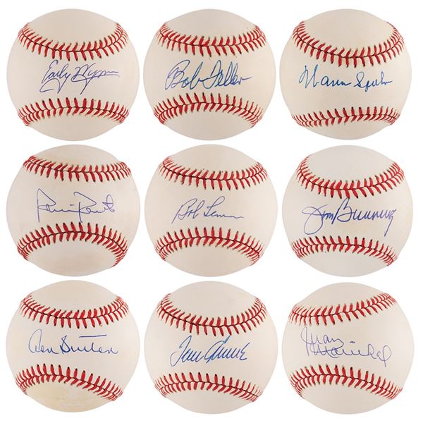 Nine official Rawlings American and National League baseballs, individually signed in blue ballpoint on the sweet spots by Hall of Fame hurlers. Signe