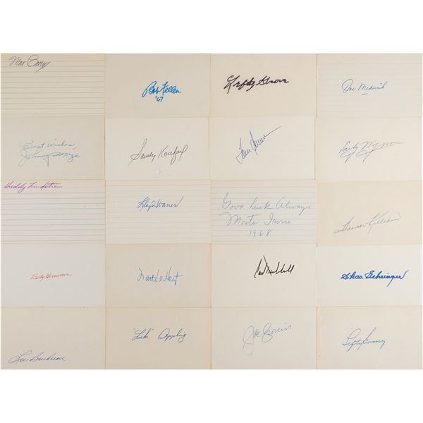 Group of 20 ink signatures of Hall of Famers on individual off-white 5 x 3 cards, including: Sandy Koufax, Tom Seaver, Early Wynn, Johnny Mize, Harmon