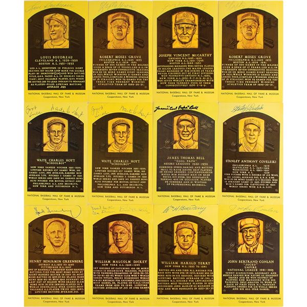 Group of 12 gold Hall of Fame plaque cards, each signed in ink by the subject. Signers are: Hank Greenberg, Joe McCarthy, Lefty Grove (2), Stanley Cov